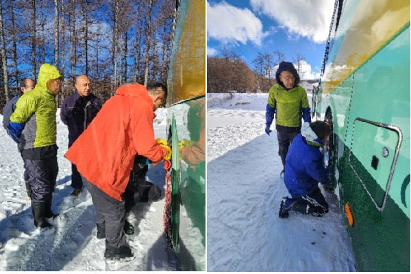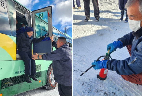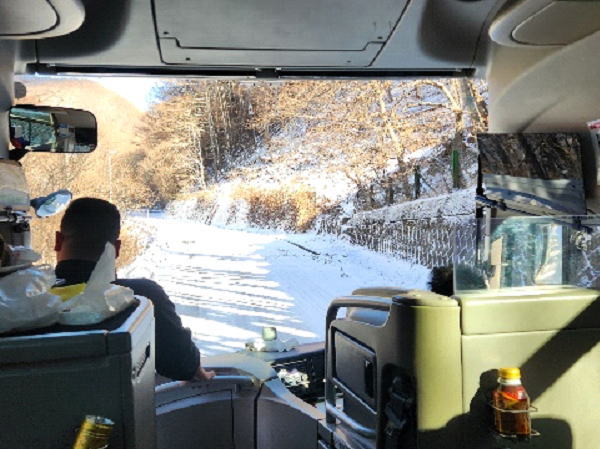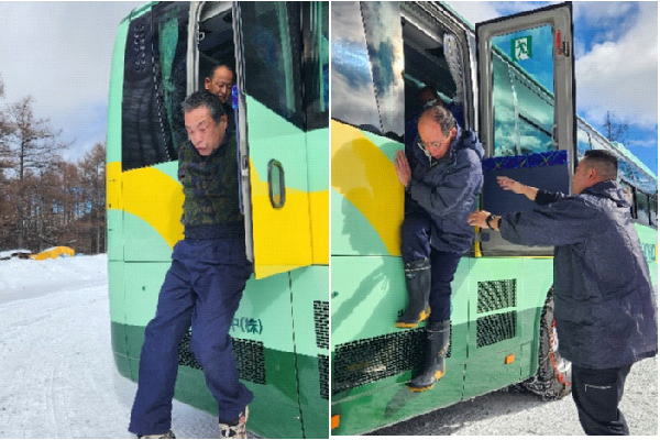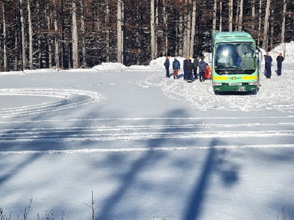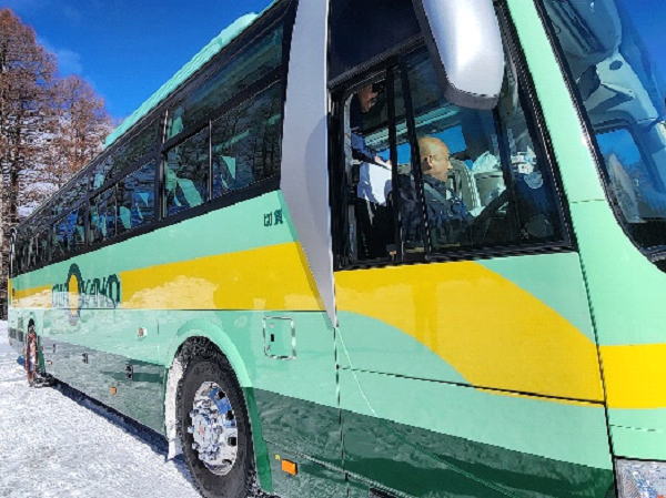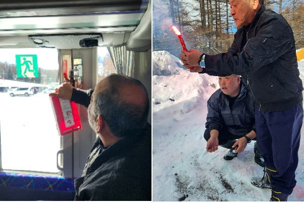 今回は 「湯の丸スキー場」を研修会場とし、指導運転士を中心に 雪道や凍結している路面でのギア、ブレーキ、ハンドル等の適切な操作方法や、安全性向上を図るための装置と、チェーン脱着所の再確認をしました。 実際に雪道を走行し、体験談を交えてディスカッション形式による全員参加型の訓練をし 「今更こんなこと聞けない…」と恥ずかしがらず、些細なことでも積極的に声を出せるよう 和やかな雰囲気での研修を心掛けました。 他に「チェーン脱着実技指導」、「事故や緊急時を想定した訓練」と併せ非常扉の開閉、三角表示板、消火器、発煙筒の使用方法の再確認をし、新人運転士や不慣れな運転士に対し、ベテラン指導運転士が丁寧に指導致しました。 また、後日 1月09日に座学研修会を開催し 雪山研修を振り返り、改めて雪山に臨む運転士の心構え、車両の冬支度や、緊急時(事故やハイジャック等)における運転士がとるべき対応と、我が社の緊急連絡体制を再確認しました。
